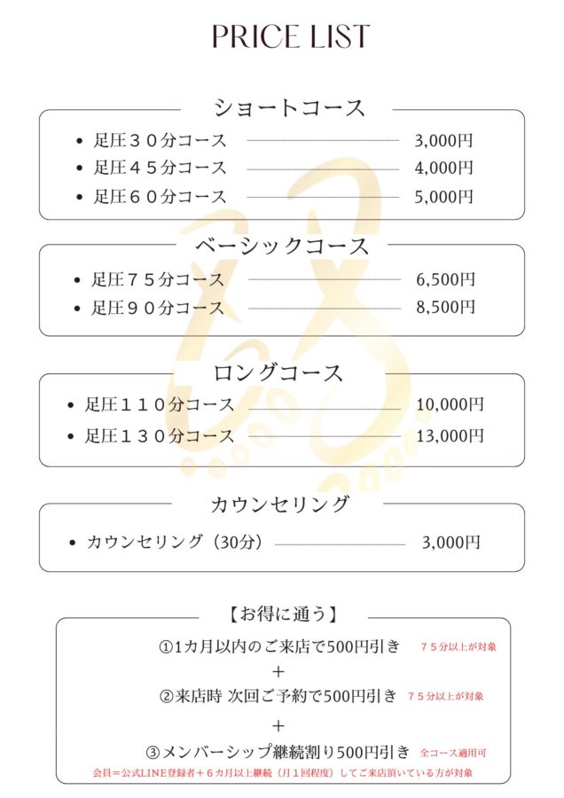 | ベーシック全身 75分コース | 6,500円 | 基本の全身施術をしっかり受けたい方に。 |