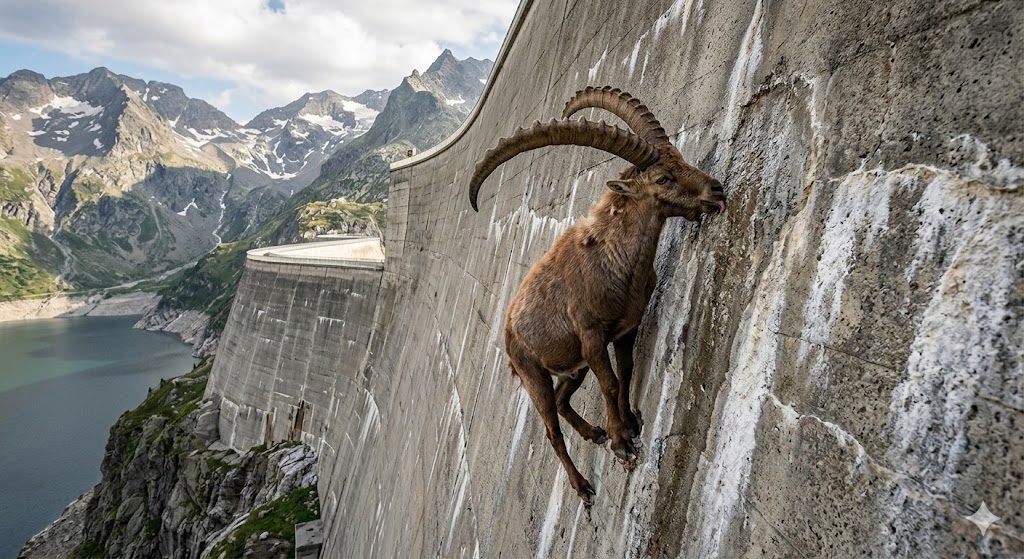 草食の彼らにとって、植物だけでは足りないナトリウムなどのミネラルを補給することは生死に関わります。そのため、崖の岩肌やダムのコンクリートから染み出す「塩分」を舐め取るために、信じられないような高所まで移動します。