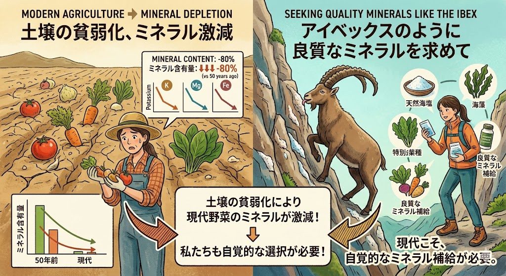 • 土壌の貧弱化 現代の野菜は、50年前に比べてミネラル含有量が激減していると言われています。だからこそ、私たちはアイベックスが崖を登るのと同じくらい、自覚的に良質なミネラル源を探さなければならない時代にいます。