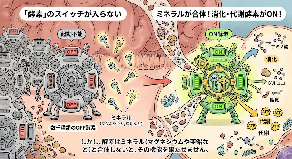 • 「酵素」のスイッチが入らない 私たちの体の中では、消化や代謝のために数千種類の「酵素」が働いています。しかし、酵素はミネラル(マグネシウムや亜鉛など)と合体しないと、その機能を果たせません。