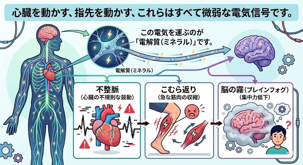 • 電気信号のバグ 心臓を動かす、指先を動かす、これらはすべて微弱な電気信号です。この電気を運ぶのが「電解質(ミネラル)」です。不足すると、不整脈、こむら返り、あるいは「脳の霧(ブレインフォグ)」のような集中力低下を招きます。