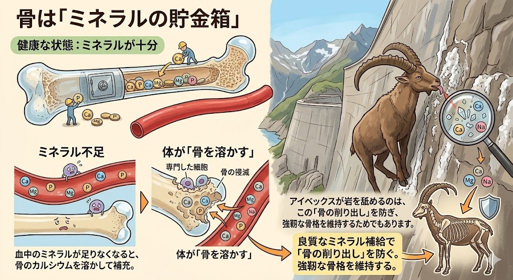 • 骨は「ミネラルの貯金箱」 血中のミネラルが足りなくなると、体は骨を溶かして補充します。アイベックスが岩を舐めるのは、この「骨の削り出し」を防ぎ、強靭な骨格を維持するためでもあります。