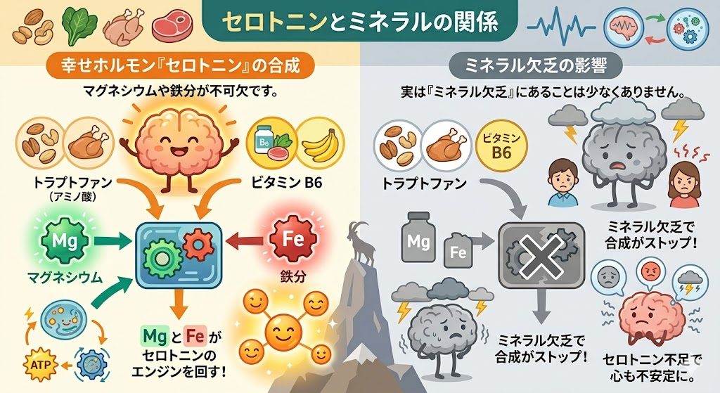 • セロトニンとミネラル 幸せホルモンと呼ばれる「セロトニン」の合成には、マグネシウムや鉄分が不可欠です。理由のない不安感やイライラの原因が、実は「ミネラル欠乏」にあることは少なくありません。