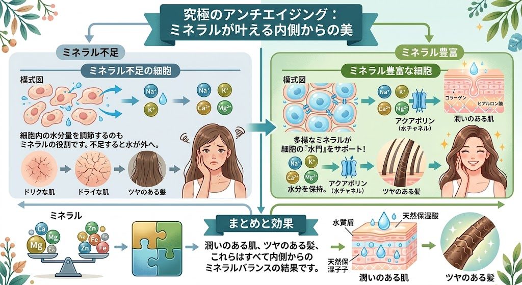 • 究極のアンチエイジング 細胞内の水分量を調節するのもミネラルの役割です。潤いのある肌、ツヤのある髪、これらはすべて内側からのミネラルバランスの結果です。