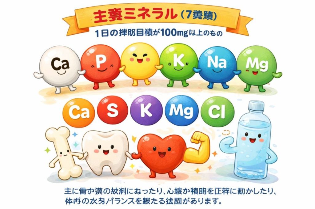 ① 主要ミネラル(7種類) 1日の摂取目標が100mg以上のもの (カルシウム、リン、イオウ、カリウム、ナトリウム、マグネシウム、塩素) 主に骨や歯の材料になったり、心臓や筋肉を正常に動かしたり、体内の水分バランスを整える役割があります。