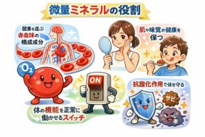 微量ミネラルは、全身に酸素を運ぶ赤血球の構成要素になったり、皮膚や味覚の健康を保ったりと、体の機能を正常に働かせるためのスイッチのような役割を担っています。