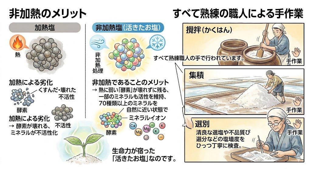 マザーソルトの最大の特徴は、全工程において一切の「加熱」を行わないことです。