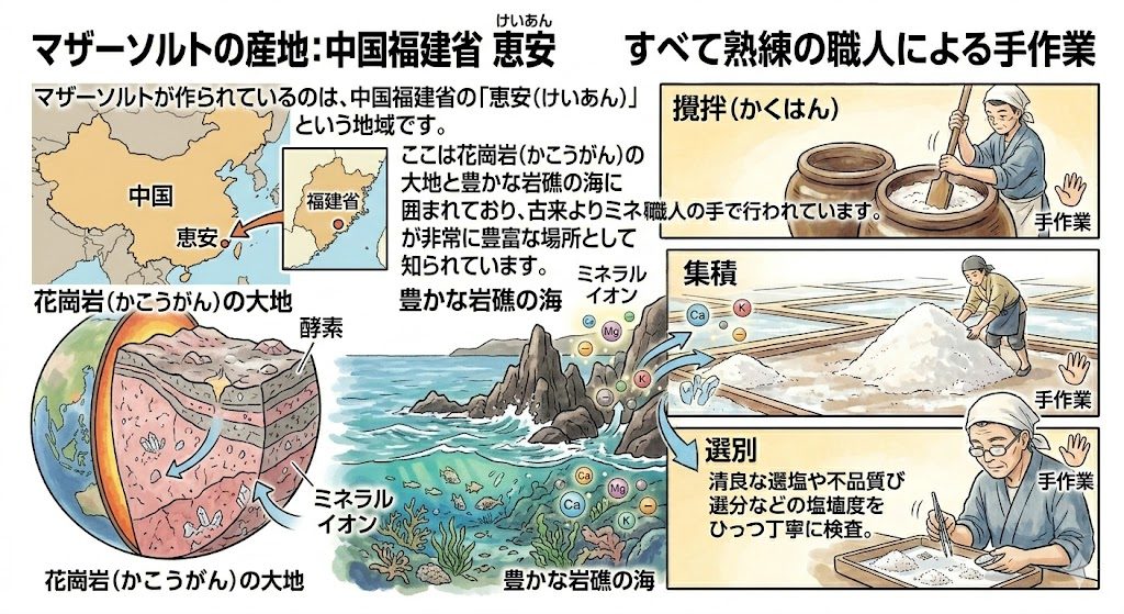 マザーソルトが作られているのは、中国福建省の「恵安(けいあん)」という地域です。 ここは花崗岩(かこうがん)の大地と豊かな岩礁の海に囲まれており、古来よりミネラルが非常に豊富な場所として知られています。