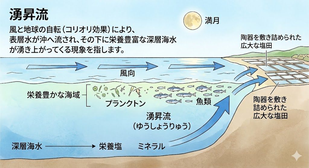 マザーソルトの物語は、海流の神秘から始まります。 深層海水が、満月の日に「湧昇流(ゆうしょうりゅう)」という天然の流れに乗って表層へと上がってきます。その特別なタイミングで汲み上げられた海水が、マザーソルトの原料です。