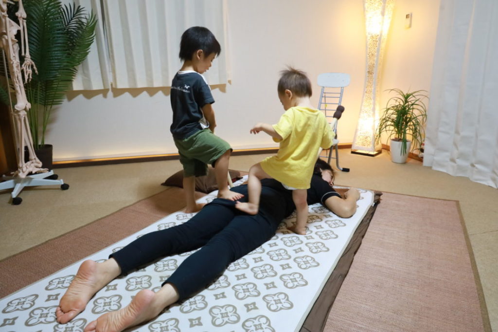 踏む人は、片足でバランスをとるため、お尻と足の筋肉を使います。また、体幹トレーニングにもなるので腹背筋の引き締めにも効果的。踏まれる人は、血液とリンパ系の流れがとても良くなり、むくみの軽減になり足がホッソリします。またアスリート同士の2人一組のストレッチに変わる体のケア方法でもあります。